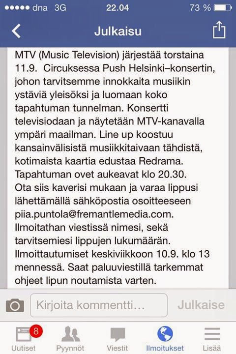 MTV Push Helsingille budjetoitiin vain 80 000 euroa markkinointiin. Kenties siksi tapahtuman Facebook-sivuille pitää etsiä vapaaehtoinen moderaattori tällaisella viestillä. |